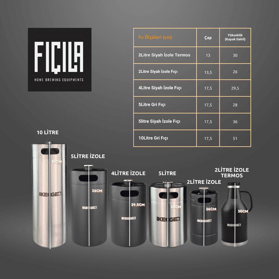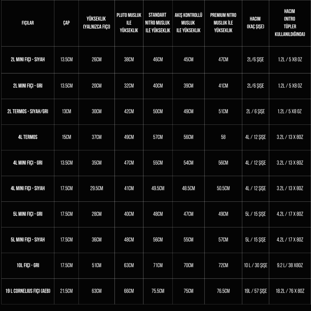 | Fıçılar | 2 Litre Termos, 2 Litre İzole Fıçı, 4 Litre İzole Fıçı, 5 Litre Fıçı, 5 Litre İzole Fıçı, 10 Litre Fıçı, Yalnızca Musluk Seti |